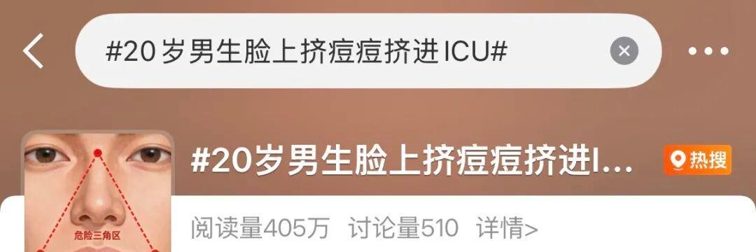 昨日,“20岁男生脸上挤痘痘挤进ICU”的话题冲上热搜,引发网友关注:20岁大学生挤了颗普通痘痘居然引发败血症,肺被“啃”出10多个洞!